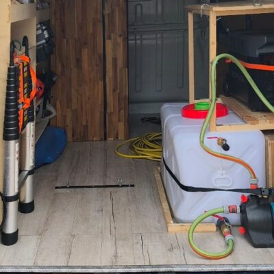 Installation d’un réservoir d’eau dans le fourgon, système de panneaux solaires sur le toit du fourgon. Nous sommes ainsi autonomes en eau et électricité.